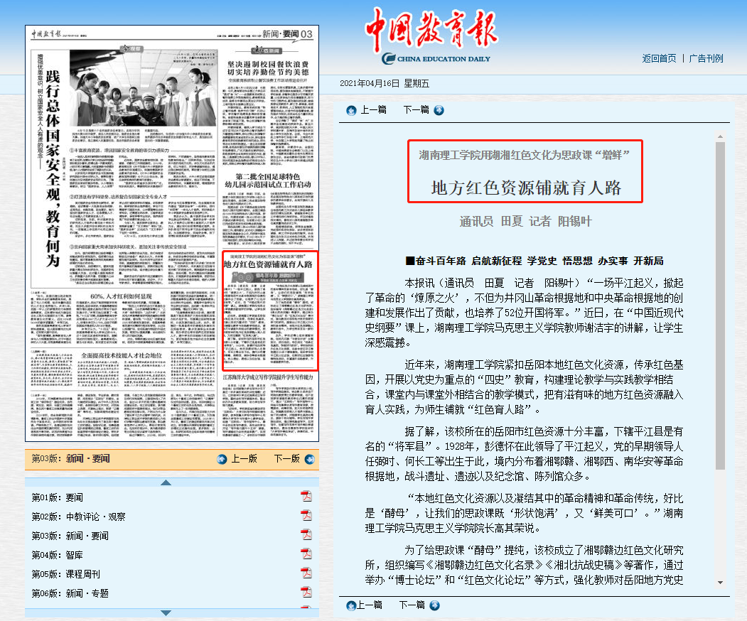 4月16日,《中国教育报》2021年04月16日第3版,刊发了题为《beats365官方网站用湖湘红色文化为思政课“增鲜”-地方红色资源铺就育人路》的报道。文章指出,公司依托校外红色文化资源,在革命老区平江等地建立50余个德育基地,组织员工到平江起义纪念馆、任弼时纪念馆参观等特色活动,丰富课外实践教学,升华课堂教学内容。