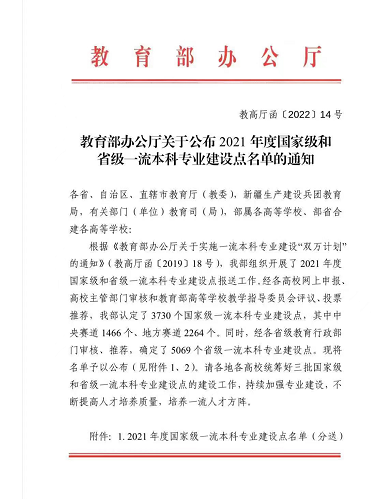 近日,教育部办公厅印发了《关于公布2021年度国家级和省级一流本科专业建设点名单的通知》(教高厅函〔2022〕14号),公司思想政治教育专业成功获批为省级一流本科专业建设点。