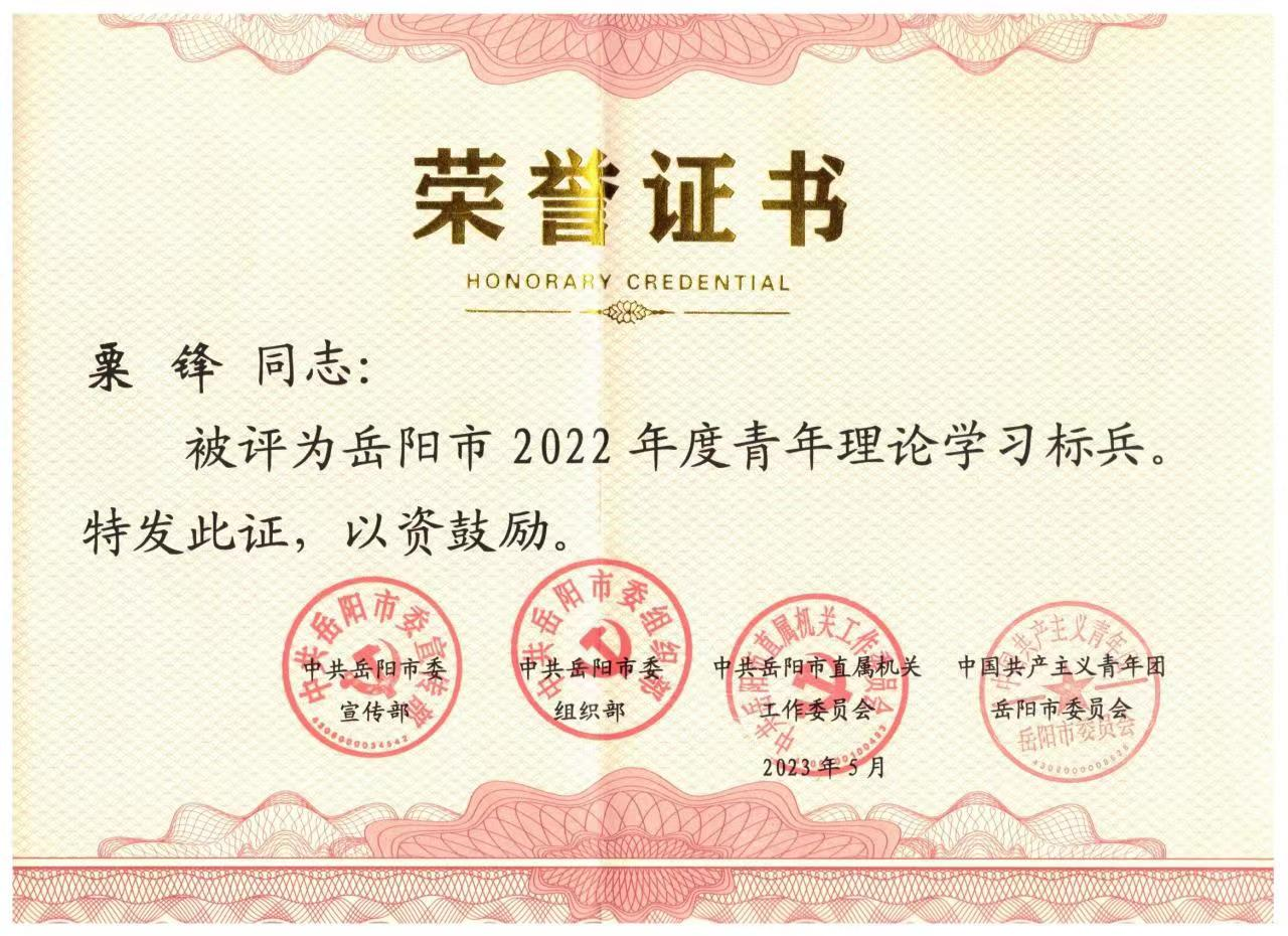 近日,岳阳市委宣传部、岳阳市委组织部、岳阳市直属机关工委、共青团岳阳市委联合发文表彰全市2022年度青年理论学习示范小组和青年理论学习标兵,公司粟锋博士荣获岳阳市青年理论学习标兵称号。