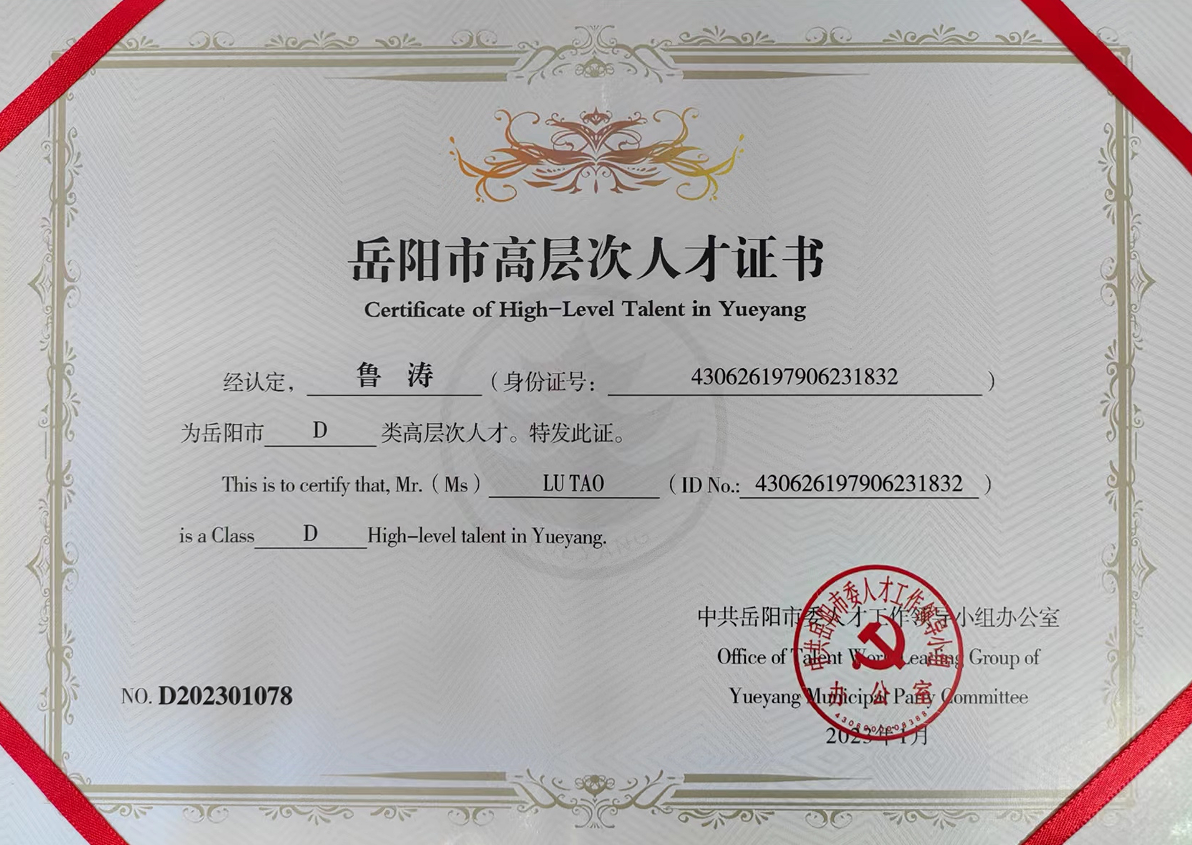 近日,中共岳阳市委人才领导小组办公室向公司鲁涛、高其荣等14位博士颁发“岳阳市高层次人才证书”。