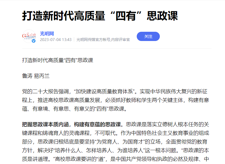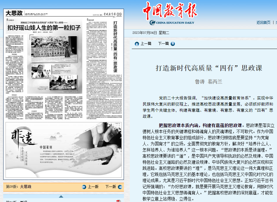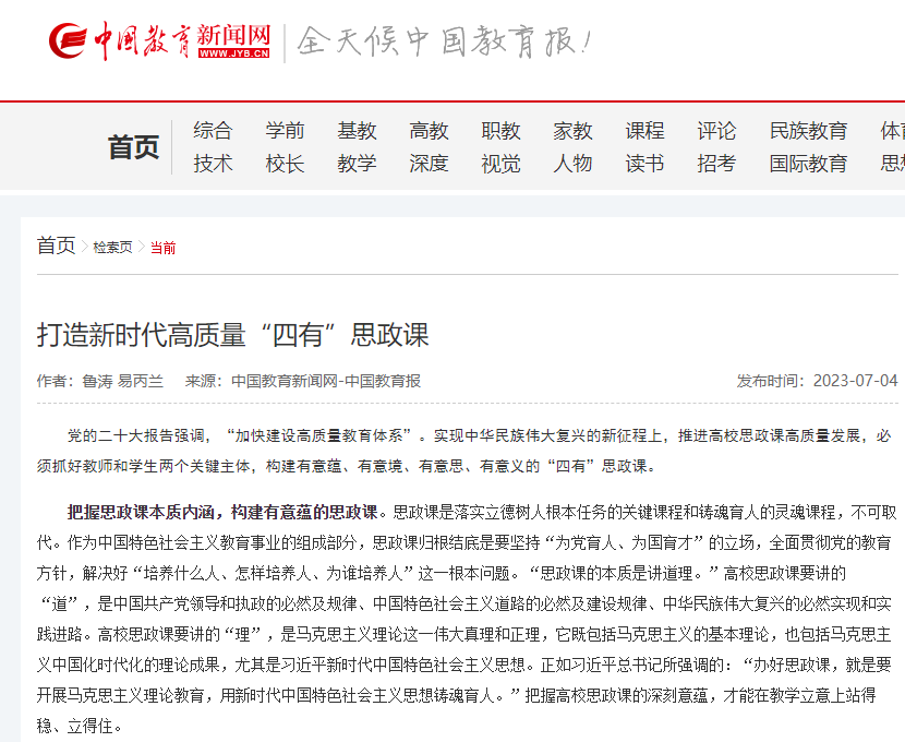 7月4日,《中国教育报》“大思政”(第09版)刊发公司经理鲁涛教授和青年博士易丙兰副教授联合署名文章《打造新时代高质量“四有”思政课》。该文结合习近平总书记关于思政课建设的重要论述、关于“大思政课”建设的重要指示,提出“必须抓好教师和员工两个关键主体,构建四有‘思政课’”:把握思政课本质内涵,构建有意蕴的思政课;拓宽思政课视域场域,构建有意境的思政课;创新思政课方式方法,构建有意思的思政课;完善思政课检验机制,构建有意义的思政课。