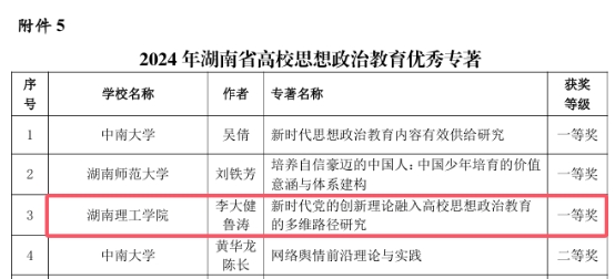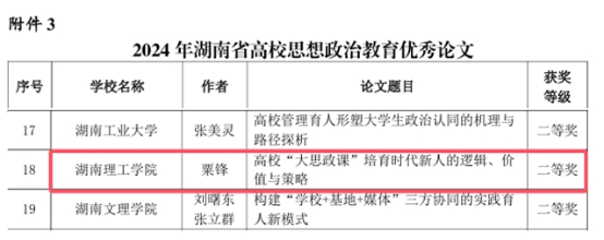 经各高校自行申报、研究会各分支机构推荐、专家组评审,全省共评选出“先进个人”92人,优秀论文60篇,优秀专著18部,优秀案例50个。其中,公司经理鲁涛教授获评“2024年湖南省高校思想政治教育研究先进个人”,李大健教授、鲁涛教授出版的著作《新时代党的创新理论融入高校思想政治教育的多维路径研究》获优秀专著一等奖,粟锋副教授撰写的论文《高校“大思政课”培育时代新人的逻辑、价值与策略》获优秀论文二等奖。