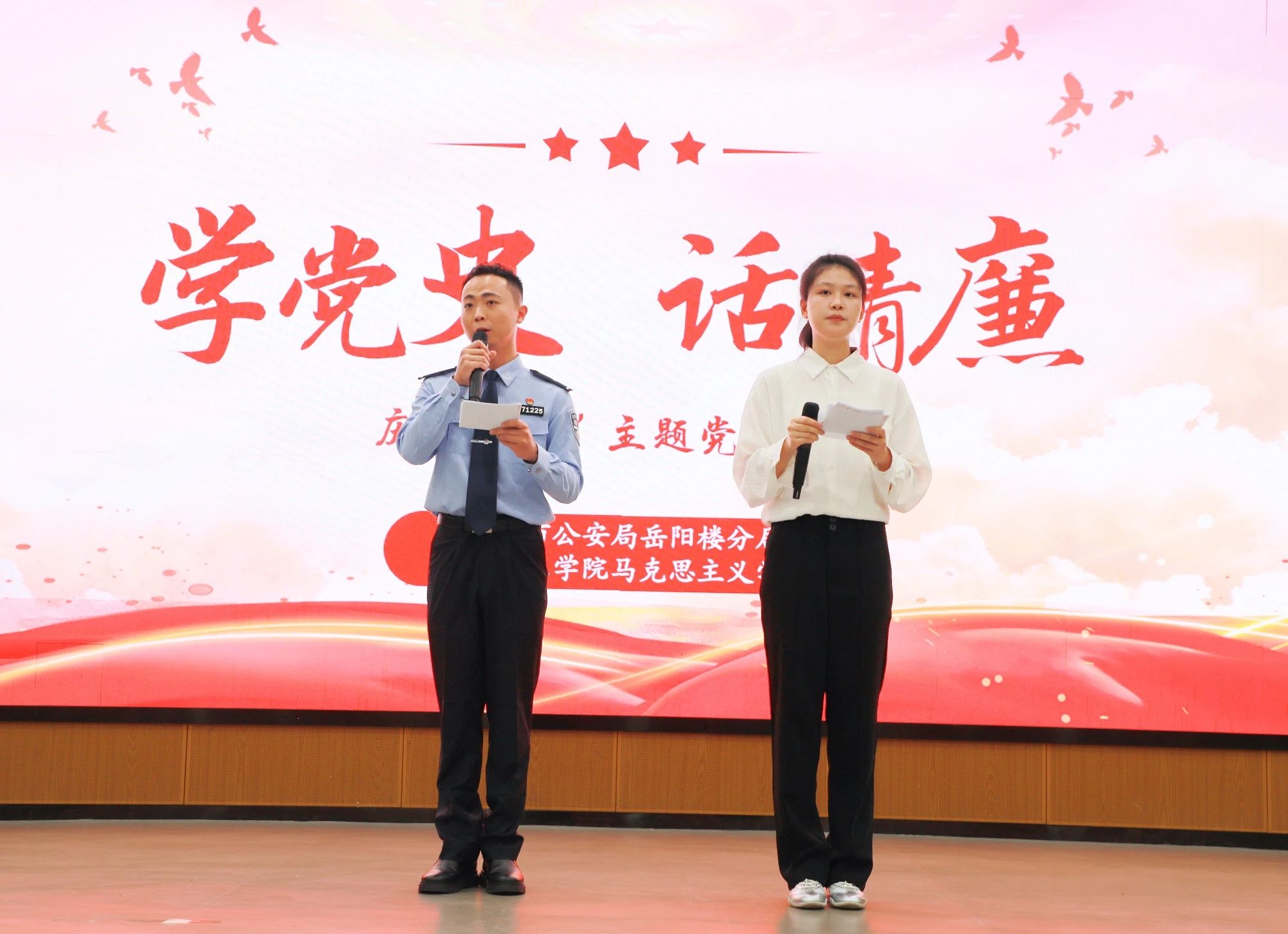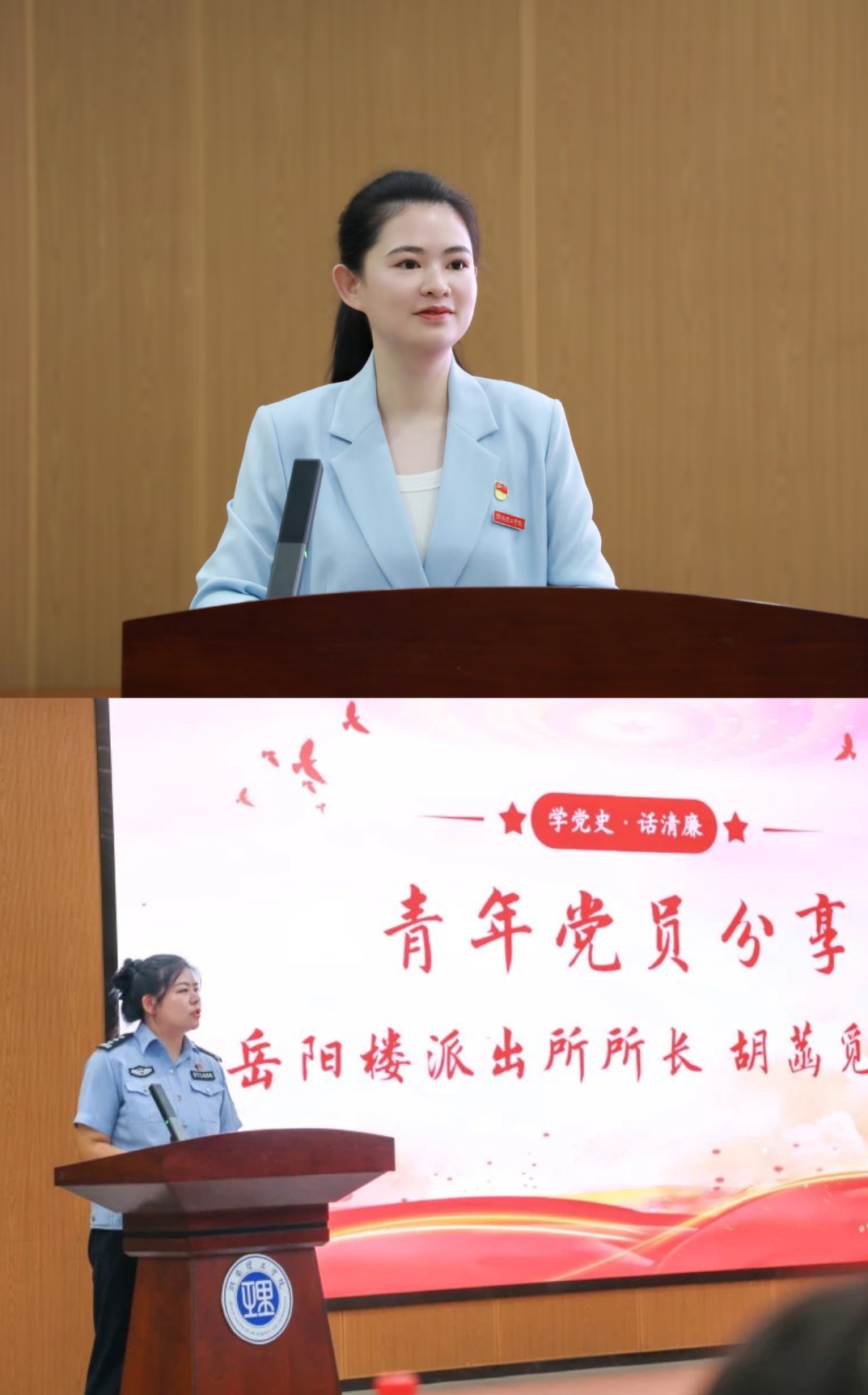 活动中,岳阳楼派出所所长胡菡觅用三组词语分享担当“红色传承,守护平安”榜样力量的感悟。谈及使命与初心时,她认为中国共产党是一部血泪史、英雄史、奋斗史、教育史,如今新时代的“爱国三问”与长征路上的“长征三问”遥相呼应,既是对历史的铭记,也是对未来的叩问。公司青年教师、思想政治教育系主任周蓓从三个维度谈关于“信仰铸清廉,青春担使命”的感悟。她指出,党史是长恒的精神丰碑,其中任弼时同志的"骆驼精神"等清廉故事为当代党员树立了榜样。另外在红色育人实践方面,周蓓表示通过"行走的思政课"、场馆教学、红色实践等形式,结合馆地校协同、警校联合等创新举措,有效推动了廉政教育走深走实。