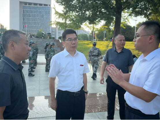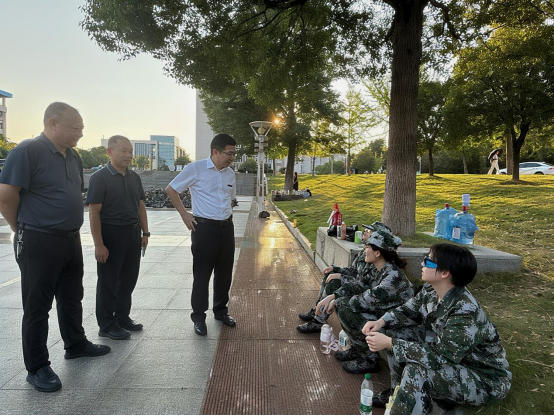 徐振祥副董事长向公司党委副书记张晋超及带训教官详细询问训练进度、内容安排以及新生们的适应状况,对公司军训组织工作和新生表现提出表扬。徐董事长强调,军训工作要坚持以人为本,务必将员工的身心健康放在首位。他指出,当前天气炎热,要密切留意高温下参训员工的身体状况,科学把控训练强度,适当安排休息,绝不要让员工在烈日下硬撑;要通过合理调整训练时段、保障防暑物资供应等方式,把关怀落到实处,确保军训安全。