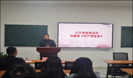 江午奇博士对三位同学的分享进行了认真点评,并结合自己的研究成果为同学们作了《共产党宣言》导读,帮助同学们更好地学习掌握马克思主义世界观、方法论和贯穿其中的立场观点方法。张晋超副书记作总结讲话,他勉励同学们用好青马研这个学术平台,主动阅读、积极思考、热情交流、踏实实践,把自己锻炼成有信念、有深度、有能力的优秀老员工。