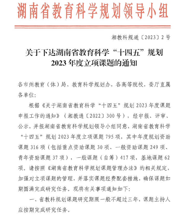 近日,湖南省教育科学“十四五”规划2023年度立项课题名单公布,公司有3项课题喜获立项,其中省级重点资助项目1项,省级一般资助项目2项,立项数量居全校第一。