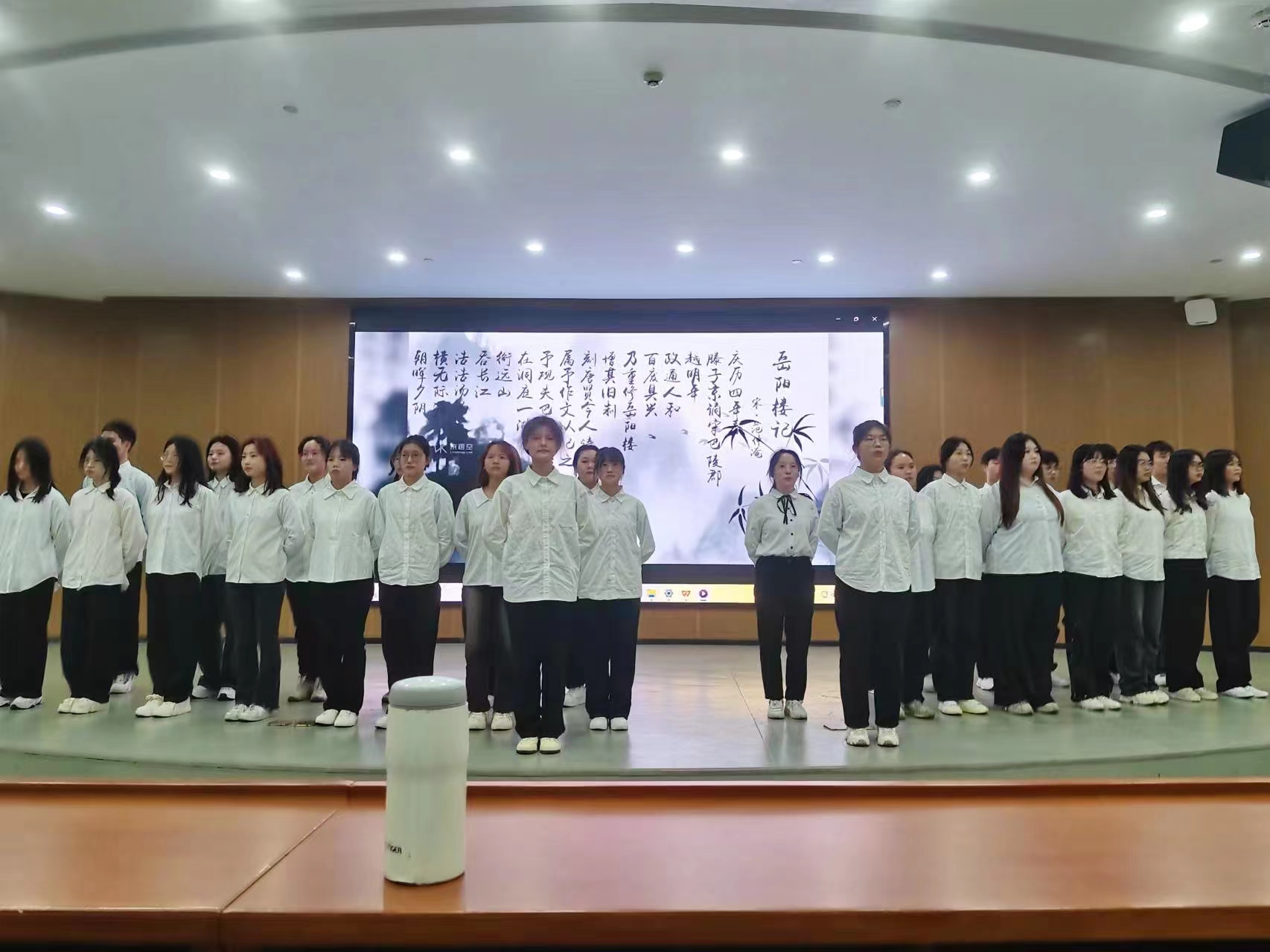 有声书表演《让爱国主义精神代代相传,发扬光大》展示了党的十八大以来,习近平总书记在不同场合多次关于“家国情怀”的谈话,指出爱国主义是中华民族精神的核心。在感受习近平总书记对“爱国”的深刻理解和深厚情怀时,让同学们了解到爱国不是一句口号,而是一种情怀和担当。由电影《风声》改编的舞台剧片段《最后的时刻》的演出让师生们回到那个血与火交织的年代,体验革命理想高于天的豪迈与悲壮。正是他们的不畏牺牲和无私奉献,才换来今天的国泰民安,盛世繁荣。三十名同学集体朗诵脍炙人口的千古名篇——《岳阳楼记》,让人重温“居庙堂之高则忧其民 ,处江湖之远则忧其君”“先天下之忧而忧,后天下之乐而乐”这些铿锵有力,直抵人心的文字,深切了解湖湘大地上永远回荡的家国情怀。师生共同出演《橘颂》改编的舞台剧《屈原》,讲述了一个对祖国有着无比的赤诚和忠贞的灵魂。“后皇嘉树,橘徕服兮。受命不迁,生南国兮。深固难徙,更壹志兮。”为了美好的理想和信念,屈原一生经历了巨大的磨难,但爱国之心始终不变。通过对《橘颂》的演绎,大家从古老的诗篇中重温家国情怀,重铸民族之魂。